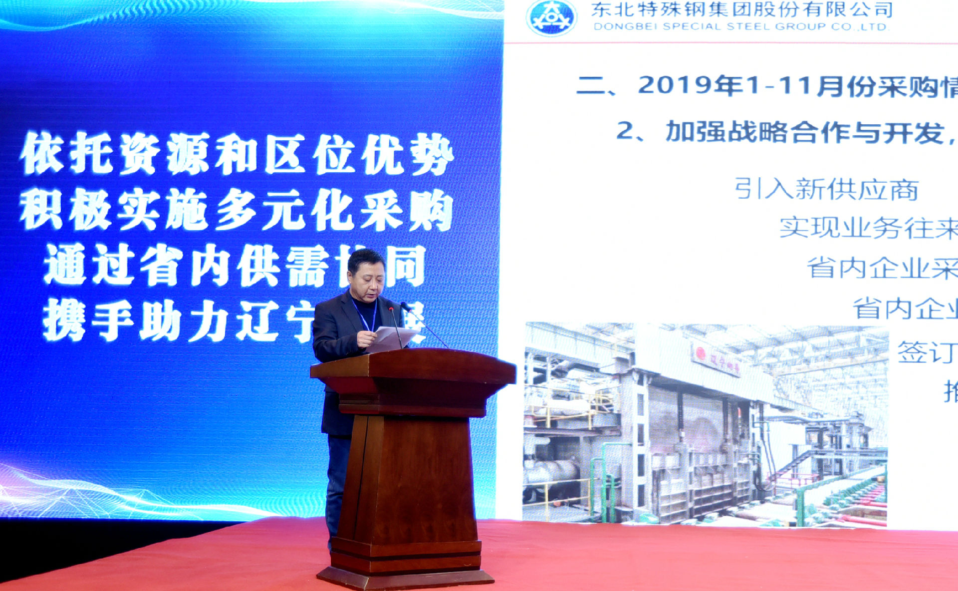作為本次大會(huì)的協(xié)辦單位,東北特鋼集團(tuán)副總經(jīng)理魏守忠在致辭中首先代表龔盛董事長(zhǎng)感謝遼寧省委、省政府一如既往給予東北特鋼集團(tuán)發(fā)展的關(guān)心和幫助,感謝省工信廳和國(guó)資委為企業(yè)搭建的“一站式”供銷對(duì)接平臺(tái),同時(shí)感謝在混合所有制改革期間對(duì)公司給予鼎力支持的省內(nèi)供應(yīng)商。